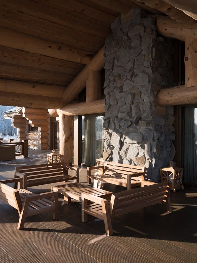 Проект предусматривает 5 входов для удобного разведения потоков гостей и персонала: парадный вход через крыльцо, выход на видовую террасу, отдельные входы в зону персонала, комнату истопника и подвал.