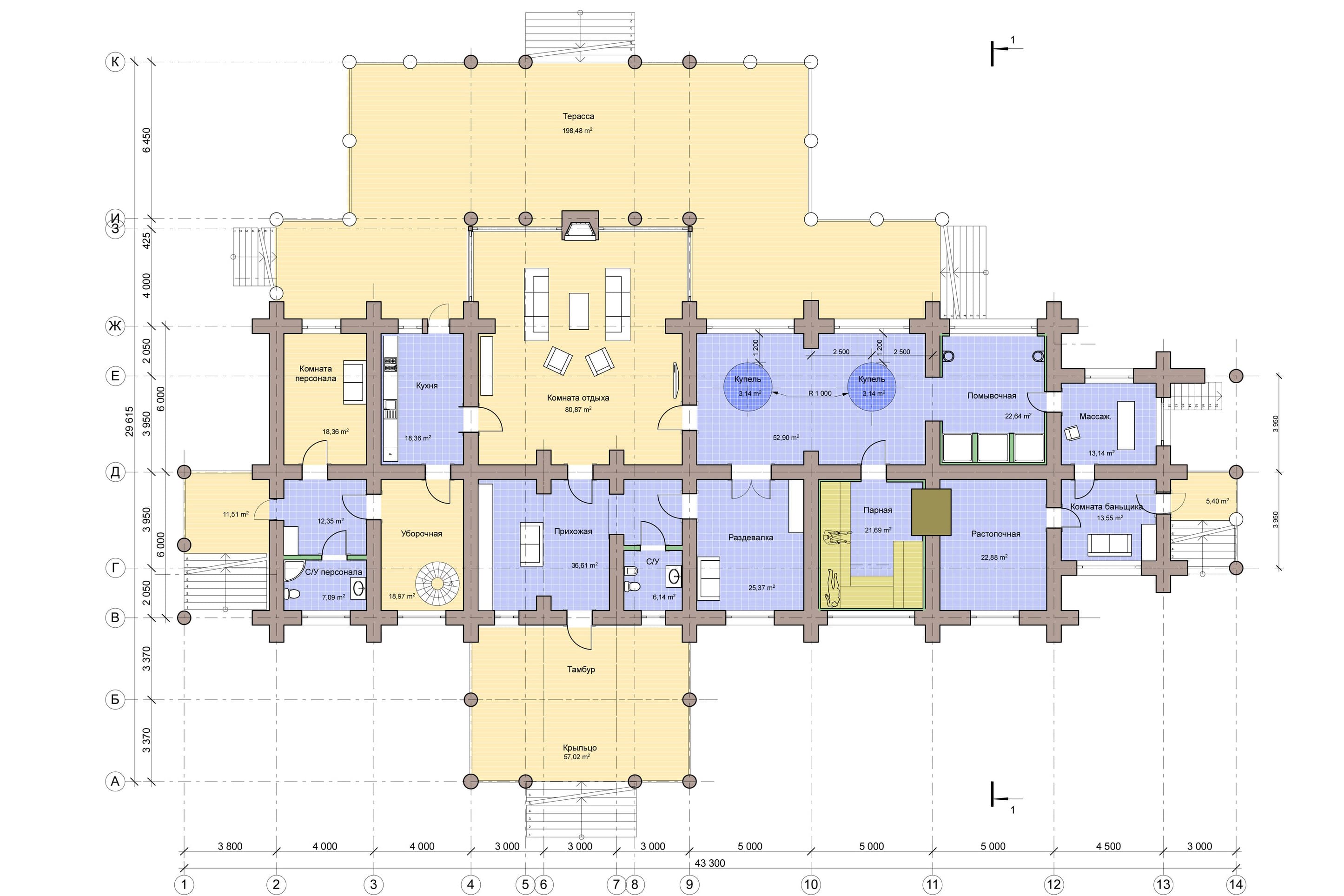 Первый уровень (1 этаж) разделен на общественную зону (холл, парная, купель, комната отдыха) и хозяйственную зону (кухня, комната персонала, сервировочная).