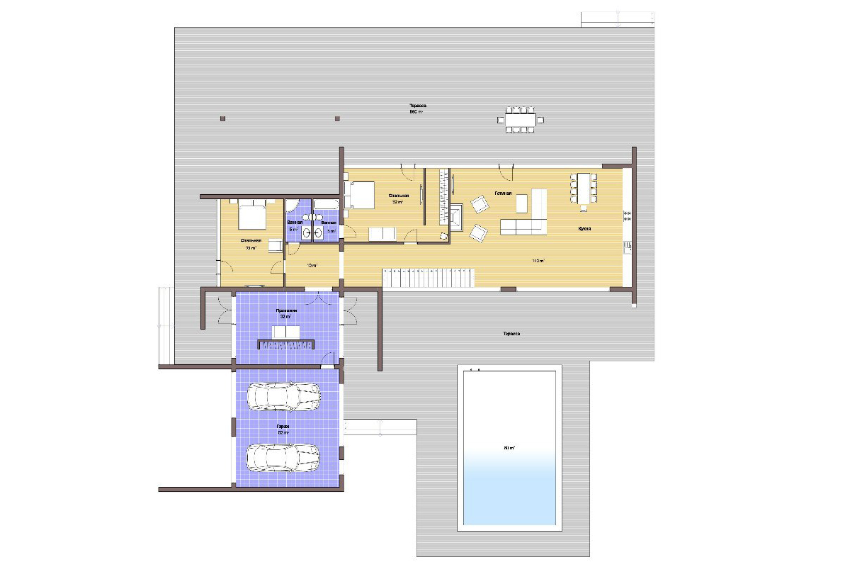 Материал стен клеёный брус. Разработан под безусадочную технологию строительства. Дом имеет два этажа. Общая площадь 470м2. В доме предусмотрены 4 спальные комнаты.